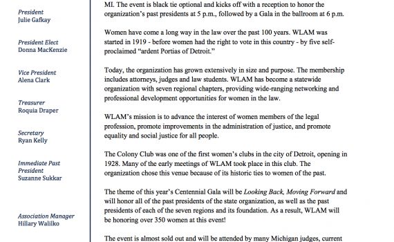 For Immediate Release: Women Lawyers Association to celebrate 100th Anniversary Detroit, MI – The Women Lawyers Association of […]